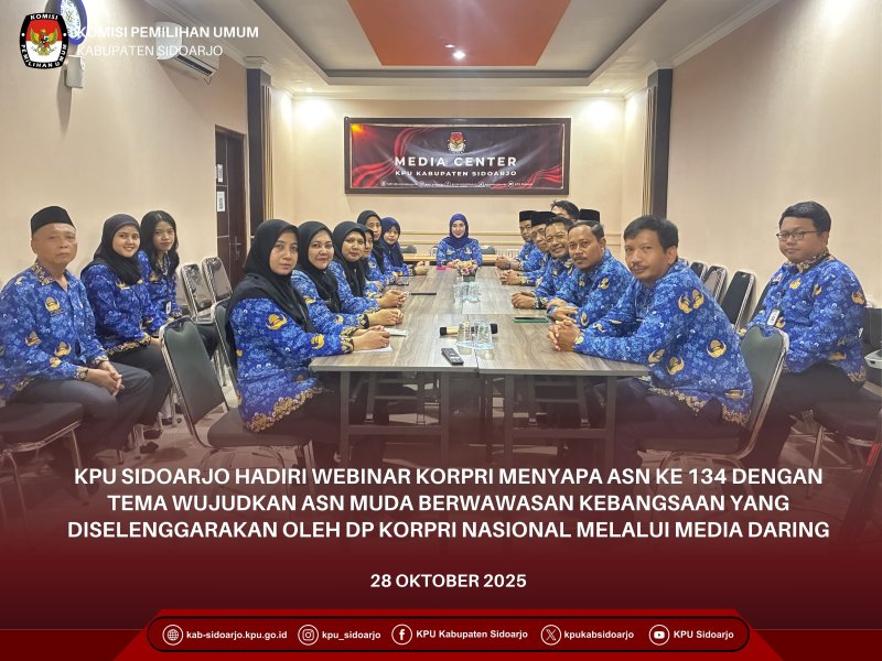 #TemanPemilih, Aparatur Sipil Negara (ASN) Komisi Pemilihan Umum Kabupaten Sidoarjo (KPU Sidoarjo) mengikuti Webinar #134 KORPRI Menyapa ASN dengan tema “ASN Muda Berwawasan Kebangsaan” yang diselenggarakan oleh Dewan Pengurus KORPRI Nasional pada Selasa, 28 Oktober 2025 melalui Zoom Meeting. Ketua Umum Dewan Pengurus KORPRI Nasional, Prof. Zudan Arif Fakrulloh, S.H., M.H., dalam sambutannya menyampaikan bahwa jika kita menengok kembali ke 97 tahun yang lalu, tepatnya tahun 1928, kita akan melihat betapa heroik dan patriotiknya para pemuda Indonesia pada masa itu, saat lahirnya Sumpah Pemuda. Kita patut mengangkat topi untuk generasi pemuda tersebut. Bayangkan, pada masa itu mereka mampu berkumpul, berpikir jauh ke depan, dan dengan luar biasa menyatakan satu nusa, satu bangsa, dan satu bahasa Indonesia. Kecerdasan para pemuda saat itu tampak dari keberanian mereka menegaskan semangat toleransi dan kebersamaan, dengan memilih bahasa Indonesia yang berasal dari bahasa Melayu sebagai bahasa persatuan. Padahal, suku Jawa sebagai kelompok terbesar kala itu rela mengalah demi kepentingan bersama, karena bahasa Indonesia dianggap lebih egaliter dan inklusif. Pilihan tersebut menunjukkan pandangan jauh ke depan demi persatuan Indonesia. Oleh karena itu, ASN masa kini perlu belajar dari semangat generasi muda 1928, bagaimana mereka mampu menyatukan bangsa melalui toleransi dan kebersamaan. KORPRI memiliki tugas besar untuk menjaga dan meneruskan semangat toleransi ini, agar persatuan bangsa tetap terjaga di tengah keberagaman. Kegiatan ini dihadiri oleh Sekretaris KPU Sidoarjo Prahastiwi Kurnia Sitorosmi, Jajaran Kasubbag, dan Staf di lingkungan KPU Sidoarjo. #KPUMelayani
