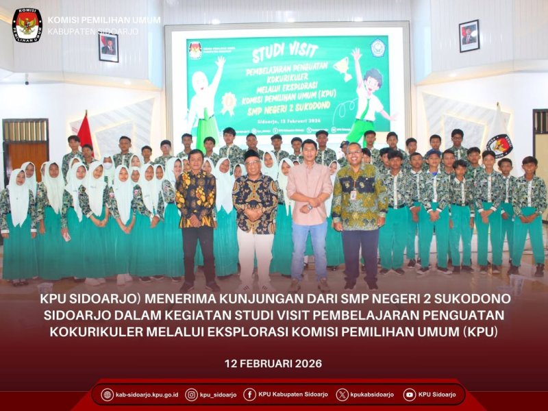 #TemanPemilih Komisi Pemilihan Umum Kabupaten Sidoarjo (KPU Sidoarjo) menerima kunjungan dari SMP Negeri 2 Sukodono Sidoarjo dalam kegiatan Study Visit Pembelajaran Penguatan Kokurikuler melalui Eksplorasi Komisi Pemilihan Umum (KPU) yang dilaksanakan di Ruang Aula Lantai 2 Kantor KPU Kabupaten Sidoarjo, pada Kamis, 14 Agustus 2025