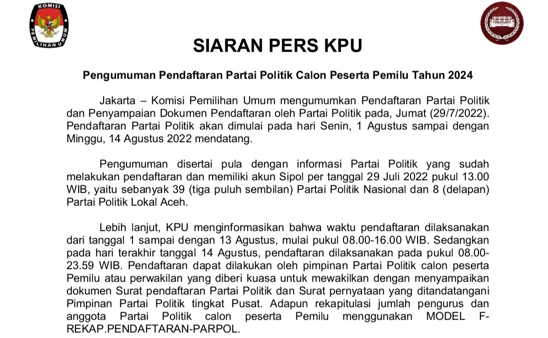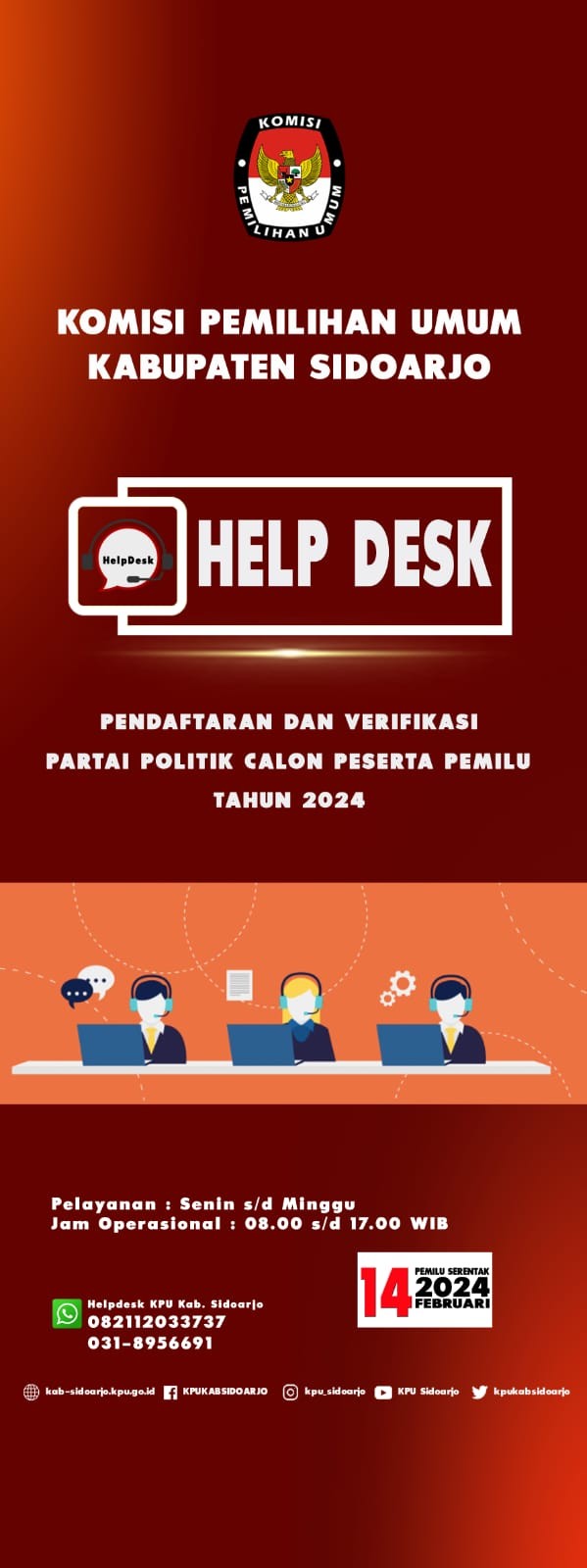 https://kab-sidoarjo.kpu.go.id - KPU Kabupaten Sidoarjo membuka layanan helpdesk untuk seluruh partai politik calon peserta Pemilu 2024. Dimana helpdesk difungsikan dengan tujuan melayani konsultasi parpol selama tahapan pendaftaran, verifikasi hingga penetapan peserta Pemilu. "Helpdesk dibuka setiap hari Senin sampai dengan Minggu pukul 08.00–17.00 WIB,” jelas Anggota KPU Kabupaten Sidoarjo Divisi Teknis Penyelenggaraan, Miftakul Rohmah, Senin (1/8/2022). Perlu diketahui bersama, mulai 1 Agustus ini hingga 14 Agustus 2022 mendatang tahapan pendaftaran parpol telah dimulai di KPU RI sebagai bagian penting persiapan Pemilu 2024. Menurut Mifta , Helpdesk di KPU Kabupaten Sidoarjo diminta agar melayani konsultasi terhadap parpol secara maksimal. Termasuk jika menemui kendala dengan Sistem Informasi Partai Politik (Sipol). Selanjutnya Mifta menyampaikan bahwa pelayanan ini juga bisa dilakukan melalui daring atau online. “Helpdesk kita juga tersedia melalui email, WhatsApp group yang telah dibuat Tim Helpdesk dengan LO partai politik tingkat Kabupaten Sidoarjo, bahkan kami juga melayani lewat pertemuan online yang telah dijadwalkan sebelumnya,” jelasnya. Disisi lain Ketua KPU Kabupaten Sidoarjo, M. Iskak menyampaikan kepada seluruh pihak baik komisioner hingga staf di KPU Sidoarjo diharapkan memahami betul regulasi terkait pendaftaran, verifikasi hingga penetapan partai politik peserta Pemilu 2024. “Karena kita tidak hanya melayani konsultasi pendaftaran, verifikasi dan penetapan, tetapi juga terkait dengan Sipol,” ujar Iskak. (Ag)