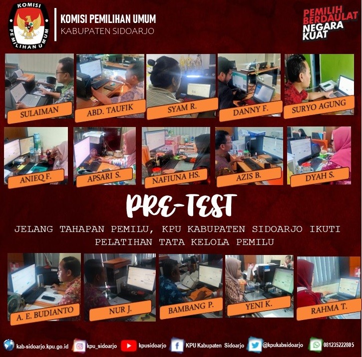 https://kab-sidoarjo.kpu.go.id- Kamis pagi (9/6), PNS Sekretariat KPU Kabupaten Sidoarjo mengikuti Pelatihan Dasar Tata Kelola Pemilu di lingkungan Sekretariat KPU Provinsi dan Sekretariat KPU Kabupaten/Kota se-Jawa Timur, di hotel Narita, Jalan Barata Jaya XVII Nomor 57-59 Surabaya. Sebanyak 14 (empat belas) peserta PNS Sekretariat KPU Kabupaten Sidoarjo bersama 245 PNS KPU se-KPU Kab/Kota dan Provinsi Jawa Timur.