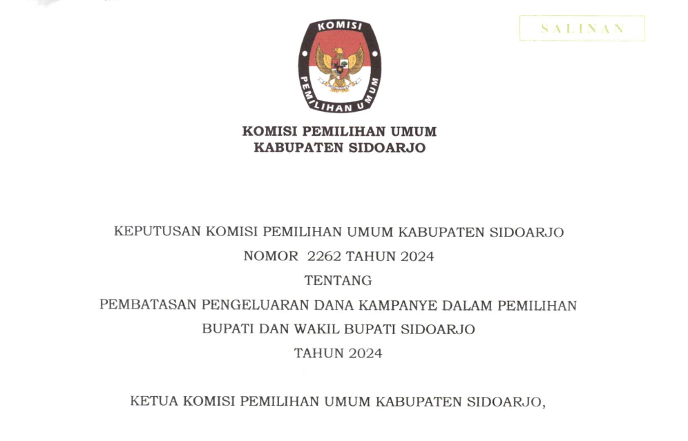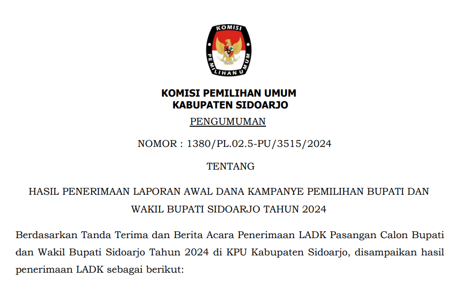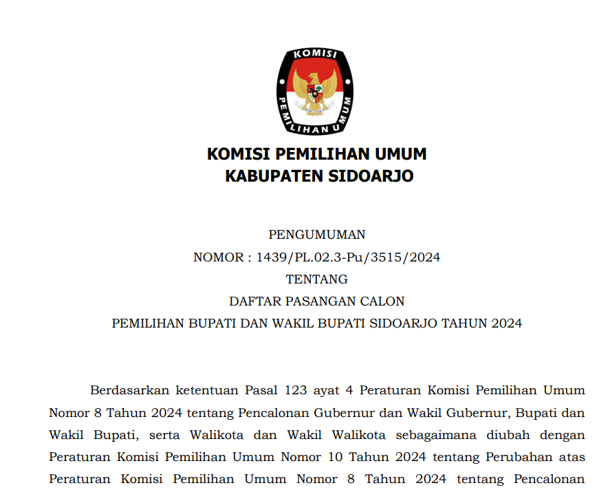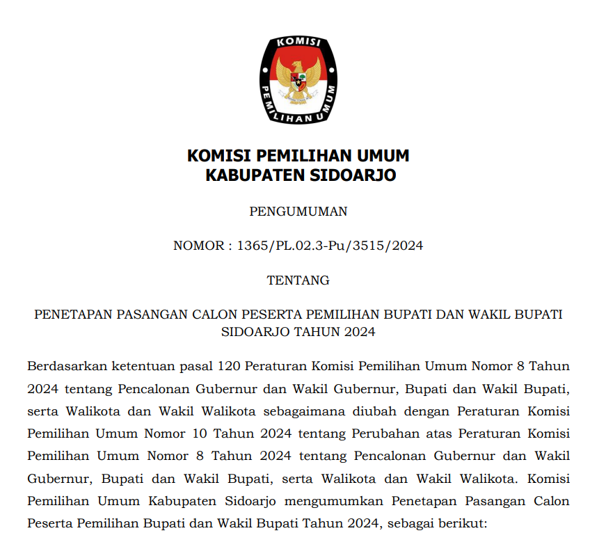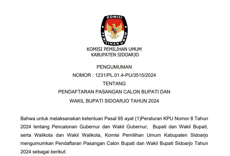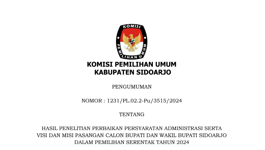 Komisi Pemilihan Umum Kabupaten Sidoarjo mengumumkan Hasil Penelitian Perbaikan Persyaratan Administrasi Serta Visi dan Misi Pasangan Calon Bupati dan Wakil Bupati Sidoarjo dalam Pemilihan Serentak Tahun 2024 sebagai berikut: