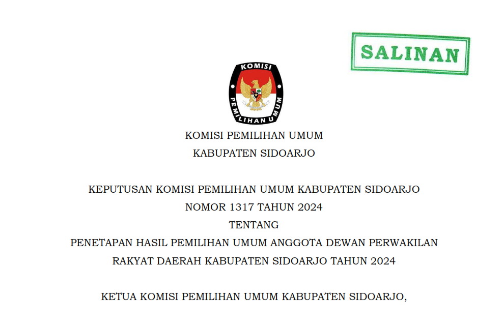 KEPUTUSAN KOMISI PEMILIHAN UMUM KABUPATEN SIDOARJO NOMOR 1317 TAHUN 2024 TENTANG PENETAPAN HASIL PEMILIHAN UMUM ANGGOTA DEWAN PERWAKILAN RAKYAT DAERAH KABUPATEN SIDOARJO TAHUN 2024