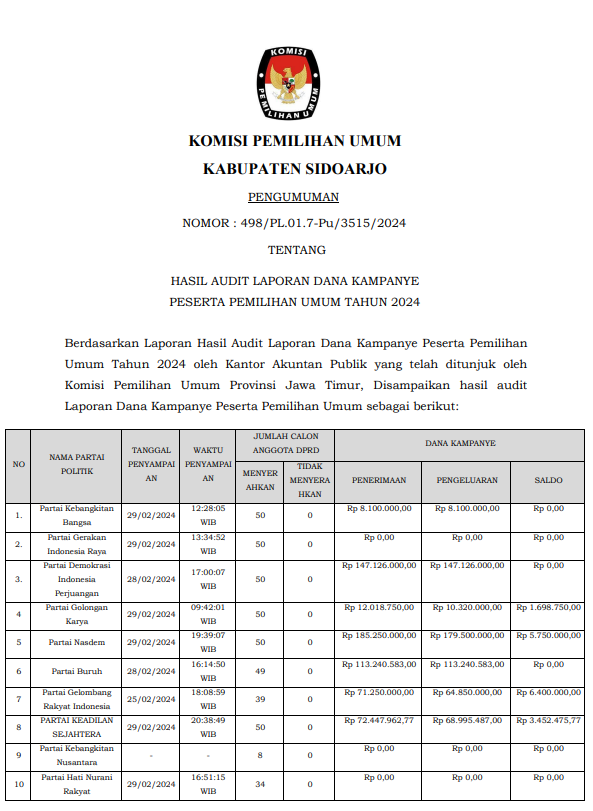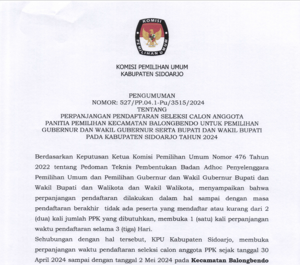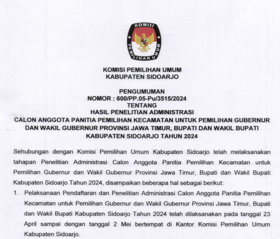 Sehubungan dengan Komisi Pemilihan Umum Kabupaten Sidoarjo telah melaksanakan tahapan Penelitian Administrasi Calon Anggota PPK untuk Pilkada 2024,