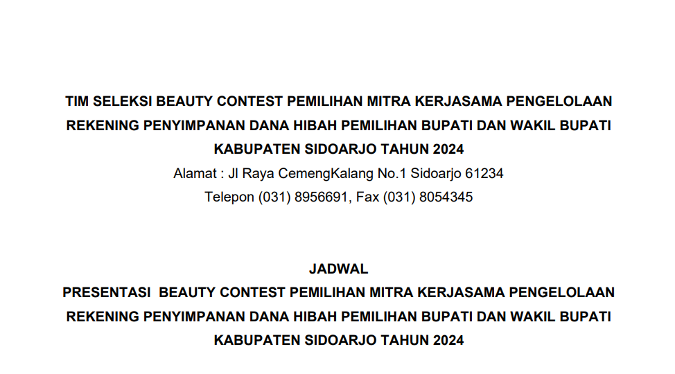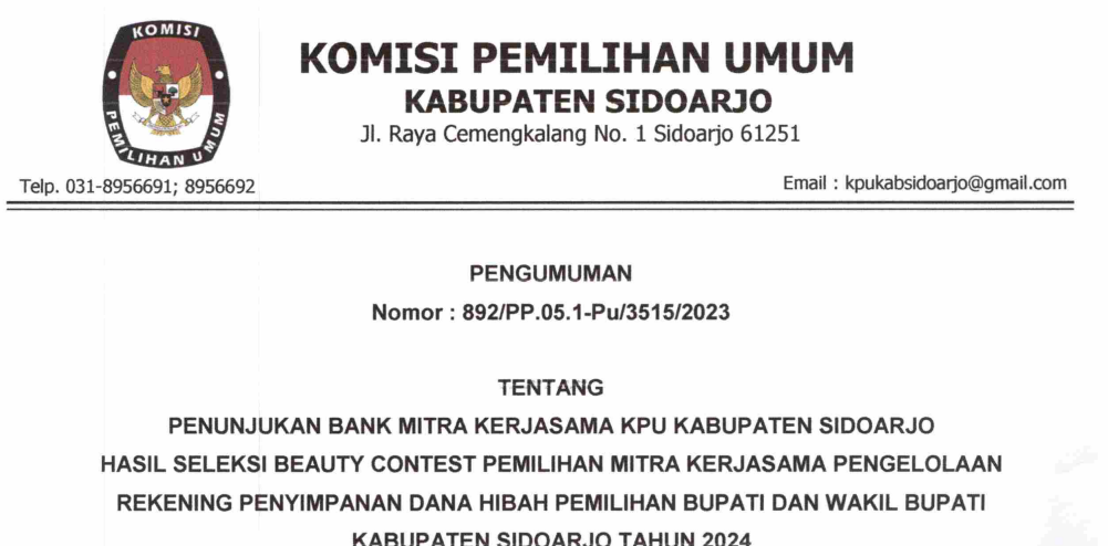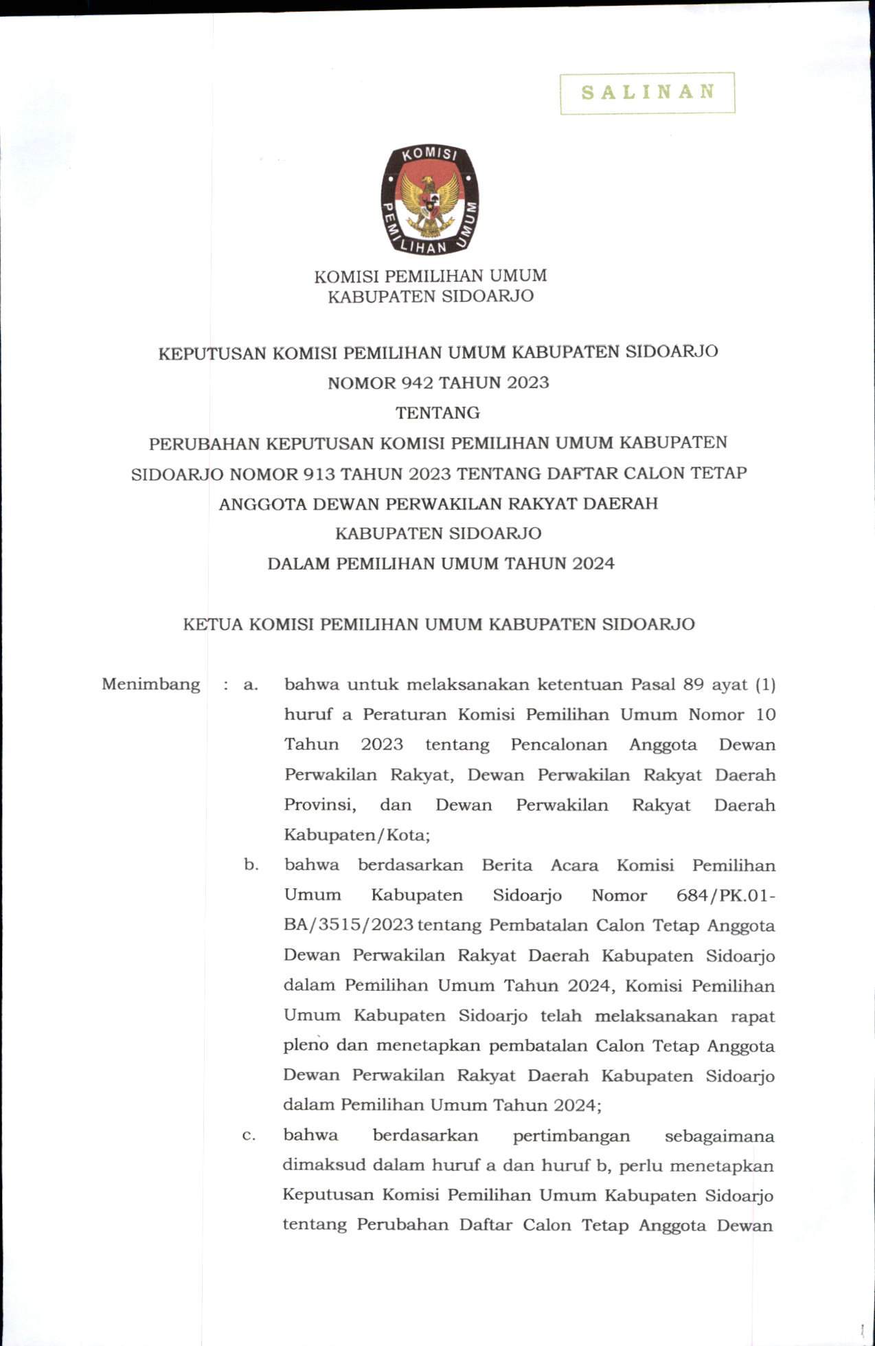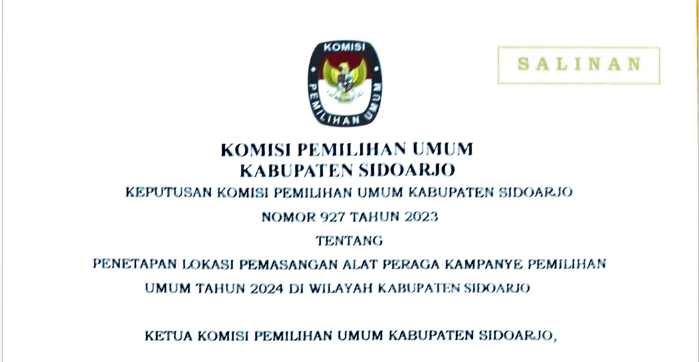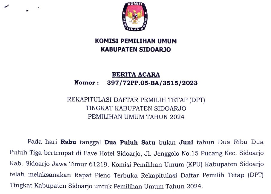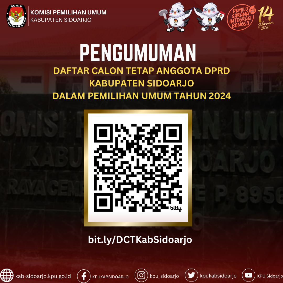 Bahwa untuk melaksanakan ketentuan Pasal 85 ayat (1) Peraturan KPU Nomor 10 Tahun 2023 tentang Pencalonan Anggota Dewan Perwakilan Rakyat, Dewan Perwakilan Rakyat Daerah Provinsi, dan Dewan Perwakilan Rakyat Daerah Kabupaten/Kota dan berdasarkan Keputusan Komisi Pemilihan Umum Kabupaten Sidoarjo Nomor 913 Tahun 2023 tentang Daftar Calon Tetap Anggota Dewan Perwakilan Rakyat Daerah Kabupaten Sidoarjo Dalam Pemilihan Umum Tahun 2024 tanggal 3 November 2023, Komisi Pemilihan Umum Kabupaten Sidoarjo mengumumkan Daftar Calon Tetap (DCT) Anggota Dewan Perwakilan Rakyat Daerah Kabupaten Sidoarjo dan persentase keterwakilan perempuan dalam DCT sebagaimana terlampir.