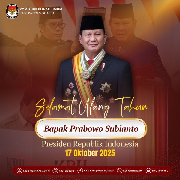 #TemanPemilih, Segenap jajaran Komisi Pemilihan Umum Kabupaten Sidoarjo (KPU Sidoarjo) mengucapkan Selamat Ulang Tahun untuk Bapak Prabowo Subianto, Presiden Republik Indonesia.
