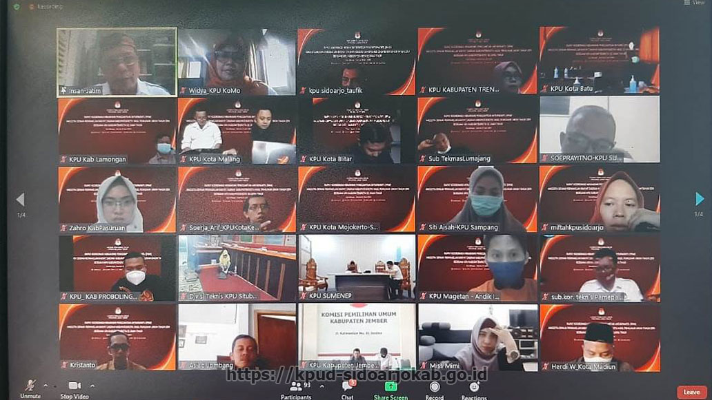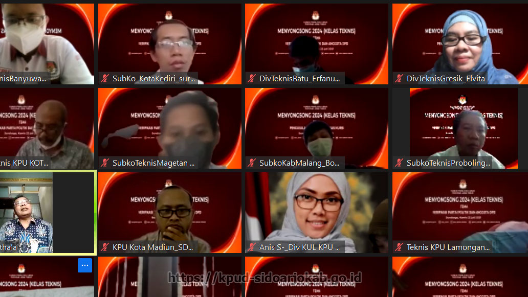 kpud-sidoarjokab.go.id-KPU Sidoarjo mengikuti Kelas Teknis tahap ke 2 (dua) yang digagas oleh KPU Provinsi Jawa Timur , dengan peserta seluruh KPU Kabupaten/Kota se-Jawa Timur, secara daring kamis (22/07/2021). Sebagaimana disampaikan oleh Komisioner Divisi SDM dan Litbang KPU Provinsi Jawa Timur, Rochani, dalam pembukaan acara kelas teknis ini, diminta seluruh komisioner dan sekretariat untuk mempersiapkan diri sebelum tahapan pemilu dilaksanakan. Kelas teknis ini merupakan momentum yang berharga untuk belajar bersama. “Saya juga mengingatkan selain mempersiapkan secara teknis, fisik dan mental juga harus dipersiapkan dengan baik karena durasi tahapan yang panjang,” tegasnya.Tema yang diangkat dalam pelaksanaan kelas teknis edisi ke 2 (dua) ini adalah Verifikasi Partai Politik dan Anggota DPD. Dalam paparan yang terbagi dalam dua sesi ini, Fatma Lestari, divisi teknis penyelenggaraan KPU Bojonegoro mengambil judul Pendaftaran dan penelitian administrasi partai politik peserta pemilu, sedangkan paparan berikutnya, Aman Ridho H, divisi teknis penyelenggaraan KPU Ngawi mengambil judul Pendaftaran dan penelitian administrasi partai politik peserta pemilu tingkat kabupaten. (HUPMAS)