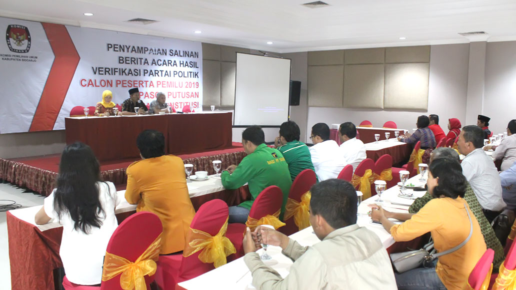 kpud-sidoarjokab.go.id – Setelah verifikasi Faktual kepengurusan dan keanggotaan dua belas Partai lama, kali ini KPU Kabupaten Sidoarjo menyampaikan salinan berita acara verifikasi faktual kepengurusan dan keanggotaan Partai Politik calon peserta pemilu 2019 pasca putusan Mahkamah Konstitusi.Kegiatan yang dilaksanakan pada (02/02) ini dimulai pukul 13.00 WIB di Sun Hotel. Dibuka oleh Ketua KPU Kabupaten Sidoarjo Mokhammad Zainal Abidin, acara tersebut selain diikuti oleh dua belas Parpol lama juga dihadiri oleh Panwas kabupaten Sidoarjo.Dua belas Parpol lama antara lain Partai Nasdem, Gerindra, PKB, PKS, PDI-P, Golkar, Demokrat, PAN, PPP, PBB, Hanura, PKPI. Selain Partai lama, penyampaian berita acara tersebut juga di ikuti oleh Partai baru yaitu Partai Berkarya dan Garuda yang telah melakukan perbaikan verifikasi faktual pada bulan Januari lalu.Dalam sambutannya Ketua KPU Kabupaten Sidoarjo menyampaikan bahwa menjaga komitmen masyarakat Sidoarjo yang sudah mempunyai kedewasaan dalam berpolitik itu sangat diharapkan dapat dijaga terus menerus dengan baik dari KPU maupun Parpol.“Mudah-mudahan dalam penyampaian hasil ini tidak ada persoalan, sehingga dapat memenuhi syarat semua, KPU Kabupaten hanya merekap, nantinya KPU RI akan mengumumkan hasil lolos tidaknya. Untuk tahapan selanjutnya ada tahapan perbaikan, baik dari kepengurusan maupun keanggotaan Parpol bagi Parpol yang belum memenuhi syarat.” Jelas Divisi Hukum Nanang Haromin. (ryan)