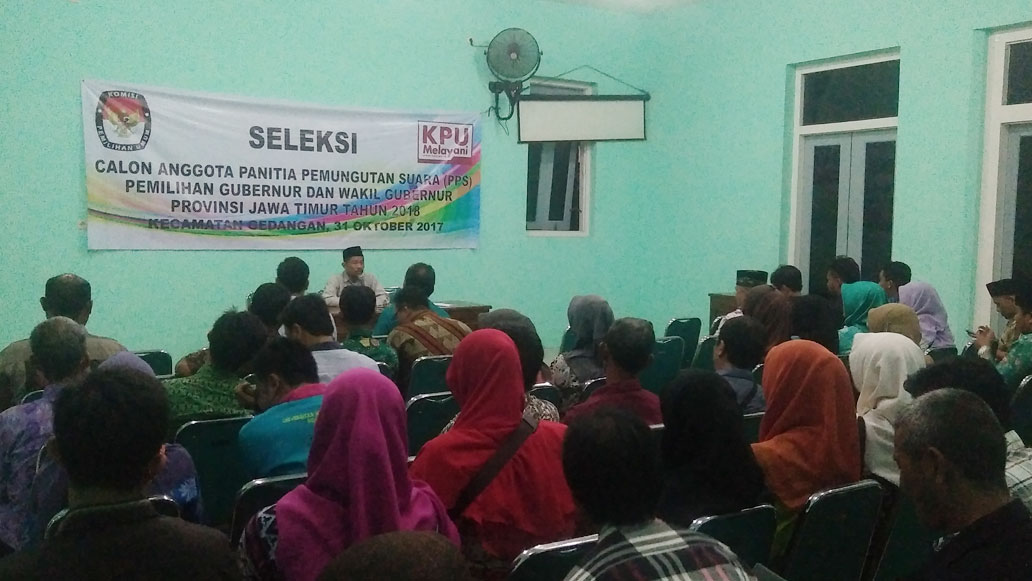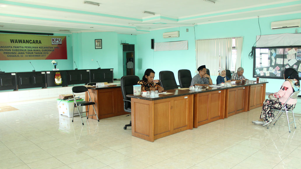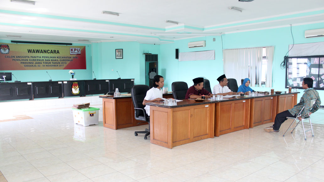 kpud-sidoarjokab.go.id-Seleksi wawancara calon PPK yang dilaksanakan pada hari terakhir Sabtu (4/11) berjalan lancar, seleksi ini dimulai pukul 08.00 WIB dan diawali dari Kecamatan Sidoarjo, tes wawancara ini adalah bagian dari proses tahapan pembentukan badan adhock pada pemilihan Gubernur dan Wakil Gubernur Jawa Timur.Satu per satu peserta memasuki aula tersebut dan di dalam aula terdapat 5 penguji yaitu Ketua KPU Kabupaten Sidoarjo Mokhamad Zainal Abidin, M.Pd.i, Divisi SDM dan Partisipasi Masyarakat Mokhammad Iskak, SE., Divisi Teknis Miftahul Rohma, M.Pd.I, Divisi Perencanaan dan Data Abdillah Adhi, SE., dan Divisi Hukum Nanang Haromin, S.sos. Masing-masing Kecamatan diberi waktu 1 (satu) jam. Dalam tes wawancara tersebut, pihak KPU terus berupaya mencari calon anggota PPK yang jujur, transparan, dan berintegritas. Hal ini dikatakan oleh Ketua KPU Sidoarjo. “Seleksi untuk menjadi anggota PPK tidak mudah, dan tidak bisa main-main, harus memiliki komitmen dan berdedikasi tinggi”, ujar Ketua KPU Sidoarjo ini.Perlu diketahui, pada gelombang terakhir ini terdapat 57 peserta dari enam Kecamatan yang mengikuti tes wawancara tersebut, yaitu Kecamatan Sidoarjo 10 peserta, Tarik 10 peserta, Jabon 7 peserta, Krian 10 peserta, Balongbendo 10 peserta, dan Wonoayu 10 peserta, sebagaimana jadwal tes pada pengumuman lampiran. (ryan)