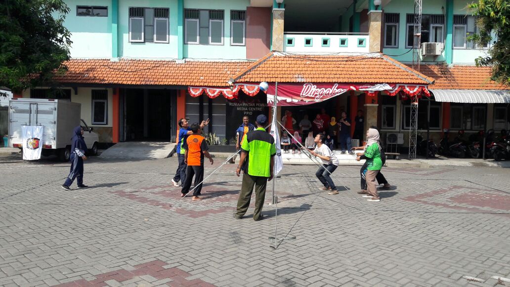 kpud-sidoarjokab.go.id–Jumat, 11 Agustus 2017 terlihat suasana meriah dihalaman KPU Kabupaten Sidoarjo. Pagi itu seluruh jajaran komisioner dan staf KPU Kab. Sidoarjo turut serta dalam rangka menyemarakkan Peringatan hari Kemerdekaan RI ke-72 dengan mengadakan berbagai macam perlombaan mulai dari bolla voli, Karaoke, tenis meja maupun lomba makan kerupuk. Kegiatan perlombaan tersebut merupakan tindak lanjut dari hasil rapat pleno pada tanggal 7 Agustus 2017 yang memutuskan bahwa KPU Kabupaten Sidoarjo harus berperan serta dalam memeriahkan peringatan HUT kemerdekaan RI ke 72 sebagai wujud apresiasi spirit nasionalisme dan menghargai jasa para pahlawan terdahulu dengan berbagai kegiatan atau perlombaan. Di sisi lain hal ini juga sebagai upaya penguatan rasa kekeluargaan seluruh jajaran komisioner, staf dan seluruh pegawai yang ada dilingkungan KPU Kabupaten Sidoarjo. Adapun yang ditunjuk sebagai ketua panitia dalam kegiatan HUT kemerdekaan RI ke 72 adalah , Achmad Eko Budianto selaku Kasubbag Umum. Dan selain kegiatan perlombaaan KPU Kabupaten Sidoarjo juga akan menggelar upacara bendera pada tanggal 17 Agustus 2017 dan bertindak sebagai inspektur upacara adalah M, Zainal Abidin dan komandan Upacara adalah Staf umum bagian protokoler Danny Ferdiansyah.(mif)
