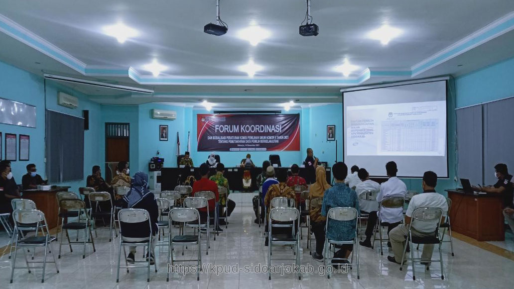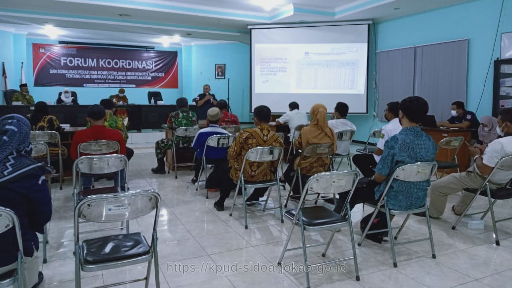 kpud-sidoarjokab.go.id-Selasa (14/12), KPU Kabupaten Sidoarjo menggelar kegiatan Sosialisasi. Materi yang diangkat dalam sosialisasi ini adalah membahas mengenai PKPU Nomor 6 Tahun 2021 tentang Pemutakhiran Data Pemilih Berkelanjutan. Peserta kegiatan ini diantaranya ketua Parpol di Kabupaten Sidoarjo, serta beberapa instansi terkait, seperti Bakesbanglinmas, Dukcapil, Kodim 0816, Polresta Sidoarjo, Kantor Kemenag, Cabang Dinas Pendidikan, dan Bawaslu Kabupaten Sidoarjo. Sosialisasi yang digelar di Hall Lantai 2 Kantor KPU Kabupaten Sidoarjo ini dimulai tepat pukul 13.30 WIB. Setelah sambutan yang disampaikan oleh Miftakul Rohmah, Komisioner Divisi Teknis Penyelenggara KPU Kabupaten Sidoarjo yang mewakili Ketua KPU yang berhalangan hadir, acara dilanjutkan oleh Musonif Afandi, Komisioner KPU Divisi Data dan Perencanaan, sekaligus sebagai pemateri pada kegiatan Sosialisasi ini. Salah satu point Materi PKPU 6 Tahun 2021 yang disampaikan Musonif berisi tentang tujuan dari kegiatan Pemutakhiran Data Pemilih Berkelanjutan ini adalah untuk memelihara, memperbaharui, dan mengevaluasi DPT Pemilu atau Pemilihan terakhir secara terus menerus dan berkelanjutan yang digunakan untuk penyusunan DPT pada Pemilu dan/atau Pemilihan berikutnya. Selain itu, dengan adanya PDPB ini, mampu menyediakan data dan informasi berskala nasional dan daerah mengenai data pemilih secara komprehensif, akurat dan mutakhir.(naf)
