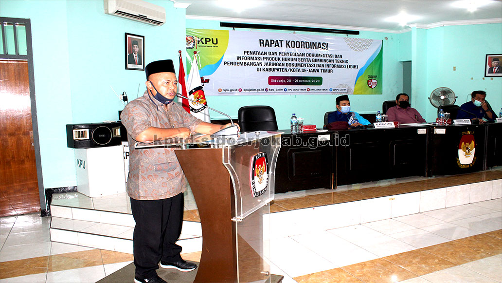 kpud-sidoarjokab.go.id-KPU Kabupaten Sidoarjo mendapatkan kehormatan menjadi tuan rumah untuk menyelenggarakan rapat koordinasi penataan dan penyediaan dokumentasi dan informasi produk hukum serta bimbingan teknis pengembangan jaringan dokumentasi dan informasi (JDIH) di kabupaten/kota se-Jawa Timur, Selasa dan Rabu (20-21 Oktober 2020). Hadir dalam rakor tersebut sekretariat KPU RI, Ketua dan Anggota KPU Jatim dan 38 komisioner KPU kabupaten/kota divisi hukum dan pengawasan serta didampingi kasubbag hukum. Meski Rapat Koordinasi JDIH ini dilaksanakan di tengah pandemi COVID-19, Panitia dari KPU Provinsi Jawa Timur tetap mewajibkan Peserta dari KPU Kabupaten/Kota mengikuti Protokol Kesehatan dengan memakai masker serta membawa hand sanitizer dan alat tulis pribadi.Dalam sambutannya, Ketua Komisioner KPU Sidoarjo, M. Iskak mengucapkan terima kasih kepada KPU Jatim yang telah memberikan kesempatan kepada KPU Sidoarjo untuk menjadi tuan rumah dalam pelaksanakan rakor hari ini. "Selamat datang di kantor KPU Sidoarjo, semoga mulai hari ini sampai besok teman-teman dari KPU yang lainnya merasa nyaman selama berada di Kabupaten Sidoarjo. Sidoarjo buka 24 jam, apabila teman-teman selepas kegiatan ini ingin melepaskan penat sejenak, banyak sekali tempat-tempat yang bisa dikunjungi di kota ini," sambut M. Iskak.Ada 3 narasumber yang menyampaikan materi adalah Kepala biro hukum sekretariat jendral KPU RI, Kepala bagian JDIH sekretariat jendral KPU RI kemudian yang terakhir Staf biro hukum sekretariat KPU RI. Materi rakor yang akan di sampaikan dalam rapat tersebut, yakni bimbingan teknis penataan dan penyediaan dokumentasi dan informasi produk hukum serta bimbingan teknis pengembangan jaringan dokumentasi dan informasi (JDIH) dilanjutkan dengan post test. Hari kedua materinya tentang pengarahan dan paparan penangana pelanggaran kode etik penyelenggara pemilihan dan pemilihan umum provinsi jawa timur. (syamsudin)