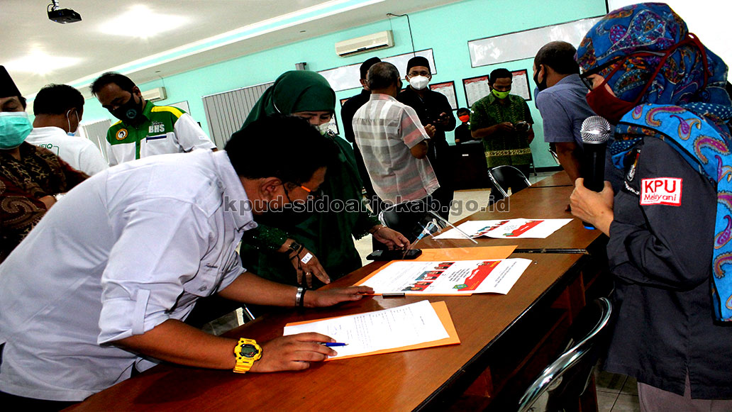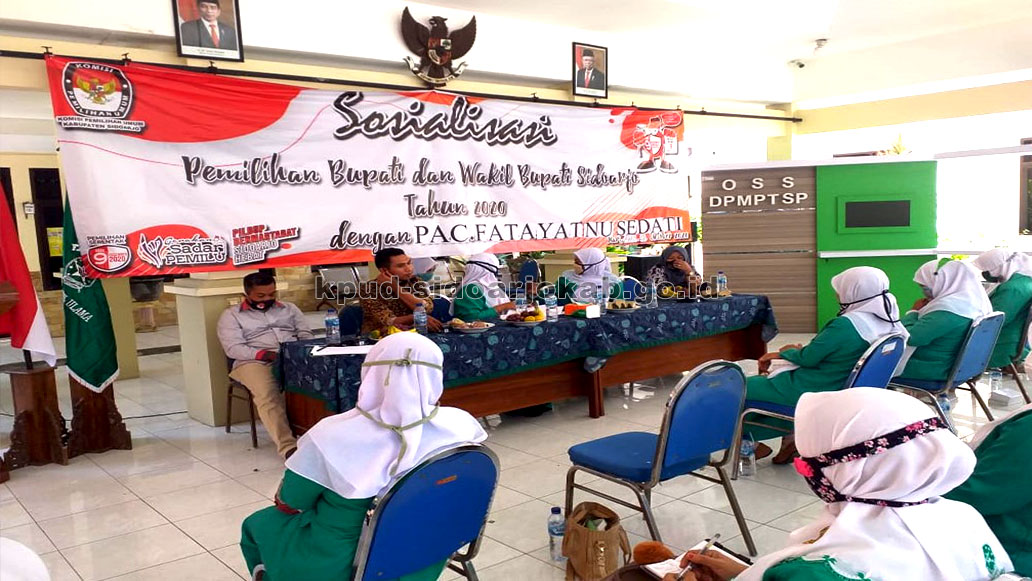 kpud-sidoarjo.go.id-KPU Kabupaten Sidoarjo melaksanakan kegiatan sosialisasi bersama PAC. FATAYAT NU SEDATI pada Minggu (04/09/2020). Sosialisasi tersebut berlangsung di Aula pertemuan kecamatan Sedati. KPU Kabupaten Sidoarjo melaksanakan kegiatan sosialisasi ini dengan harapan dapat meningkatkan jumlah partisipasi dan mensukseskan Pilbup 2020.Hal yang sangat berbeda ketika acara pembukaan ceremonial di mulai, pasti bersama-sama menyanyikan lagu Indonesia Raya. Namun, untuk kali ini tidak hanya lagu Indonesia Raya saja yang dinyanyikan, melainkan ada lagu tambahan yaitu mars Su’banul Wathon atau Cinta Tanah Air. Lagu ini sempat populer di kalangan kaum warga Nahdhiyin, pasalnya lagu ini bermuatan lagu perjuangan tentang cinta tanah air.Acara yang berlangsung sangat khidmat tersebut dibuka langsung oleh Camat Sedati. "Dengan membacakan bismilah, kegiatan sosialisasi pemilihan Bupati dan Wakil Bupati Sidoarjo 2020 bersama PAC Fatayat NU Sedati, saya buka," ungkapnya saat di acara.Sementara itu, komisioner KPU Kabupaten Sidoarjo Fauzam adim, saat memberikan materi berpesan kepada PAC Fatayat NU Sedati untuk ikut berpartisipasi dan menjadi pelopor gerakan dalam mensukseskan pemilihan Bupati dan Wakil Bupati 2020. “Kami dari KPU Sidoarjo mengajak sahabati – sahabati fatayat NU Sedati untuk membantu KPU mengemban amanah dalam proses pemilihan Bupati dan Wakil Bupati Sidoarjo 2020, dengan memastikan namanya telah terdaftar dan mengajak saudara tetangga mengecek langsung namanya di desa/kelurahan atau Cek di https:lindungihakpilihmu.kpu.go.id ” ujarnya.Kegiatan sosialisasi ini di hadiri oleh Babinsa, Panwascam Sedati dan Camat Sedati. Ketua Fatayat NU Sedati mengungkapkan dalam acara bahwa Fatayat NU siap ikut berpartisipasi dan membantu sosialisasi Pemilihan Bupati dan Wakil Bupati Sidoarjo tahun 2020. "Sudah menjadi kewajiban masyarakat Sidoarjo untuk mensukseskan Pilbup ini. Termasuk juga kami dari warga Nahdliyin, siap untuk membantu sosialisasi ke masyarakat," ungkapnya (syamsudin )