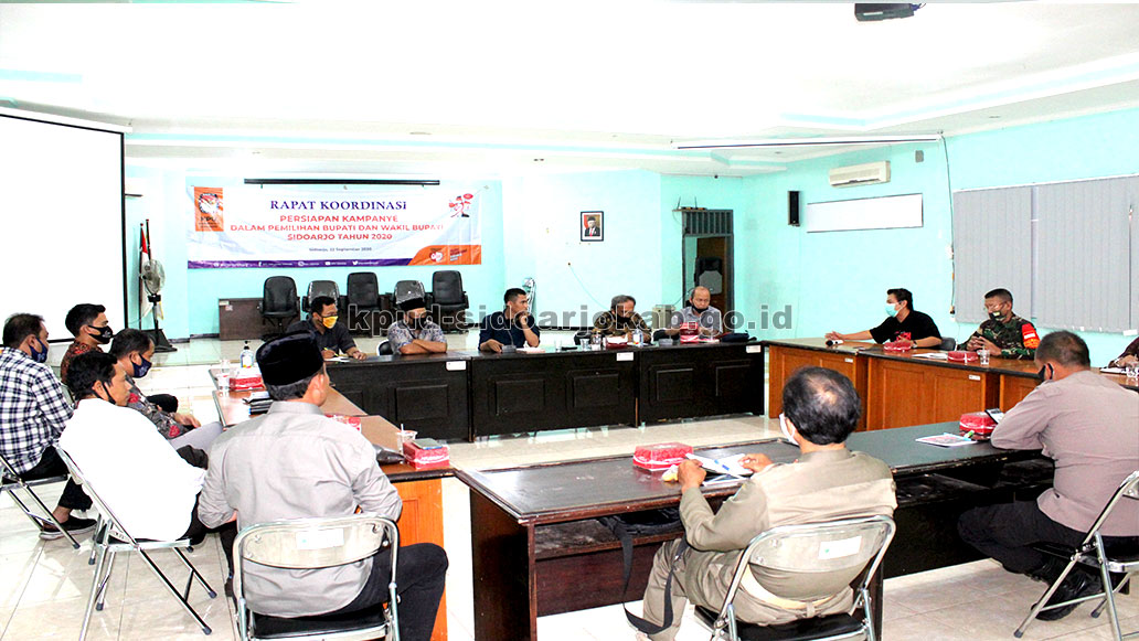kpud-sidoarjokab.go.id-Menjelang tahapan penetapan bakal pasangan calon Bupati dan Wakil Bupati Sidoarjo 2020, Komisi Pemilihan Umum (KPU) Sidoarjo menggelar rapat koordinasi persiapan kampanye dalam pemilihan Bupati dan Wakil Bupati Sidoarjo tahun 2020, Selasa (22/09/2020). Rakor yang digelar di Aula Lantai II KPU Sidoarjo dengan menerapkan protokol kesehatan ini dihadiri oleh Forkopimda Sidoarjo, Bawaslu Sidoarjo, serta perwakilan LO bakal calon. Sesuai jadwal, masa kampanye Pilbup akan dimulai pada 26 September hingga 5 Desember 2020 mendatang.Komisioner KPU Sidoarjo Divisi Sosdiklih, SDM, dan Parmas, Fauzan Adim menjelaskan aturan kampanye Pilbup Sidoarjo tahun 2020 kepada LO bakal calon yang hadir dalam rakor. "Dalam PKPU 6 Tahun 2020 pasal 61 tentang Pemasangan Alat Peraga Kampanye, kami fasilitasi 2 buah setiap Desa. Sedangkan umbul-umbul di tingkat kecamatan per paslon mendapatkan 20 buah. Paslon dapat melakukan penambahan 200% dari fasilitas yang kami berikan, tentu saja selama itu tecatat di KPU," jelasnya.Lebih lanjut, Fauzan mengungkapkan bahwa pihaknya telah melakukan koordinasi dengan PPK dan PPS terkait titik lokasi pemasangan baliho dan alat kampanye lainnya. "Seminggu yang lalu, kita sudah koordinasi dengan PPK dan PPS. Nantinya, teman-teman akan mulai melakukan pemasangan di titik-titik yang telah ditentukan," ungkap Fauzan.Dalam kesempatan yang sama, Agung Nugraha, Komisioner Bawaslu Sidoarjo, menyinggung bahwa pilkada kali ini berbeda dengan sebelum-sebelumnya karena dilakukan di masa pandemi. Untuk itu, protokol kesehatan adalah hal mutlak yang harus diutamakan dalam setiap tahapan. "Harapan kami, di masa kampanye ini kita bisa berkoordinasi dengan tim paslon, sehingga protokol Covid-19 bisa menjadi prioritas utama dan perhelatan pilbup Sidoarjo dapat berjalan dengan lancar dan aman," jelasnya. (syamsudin)