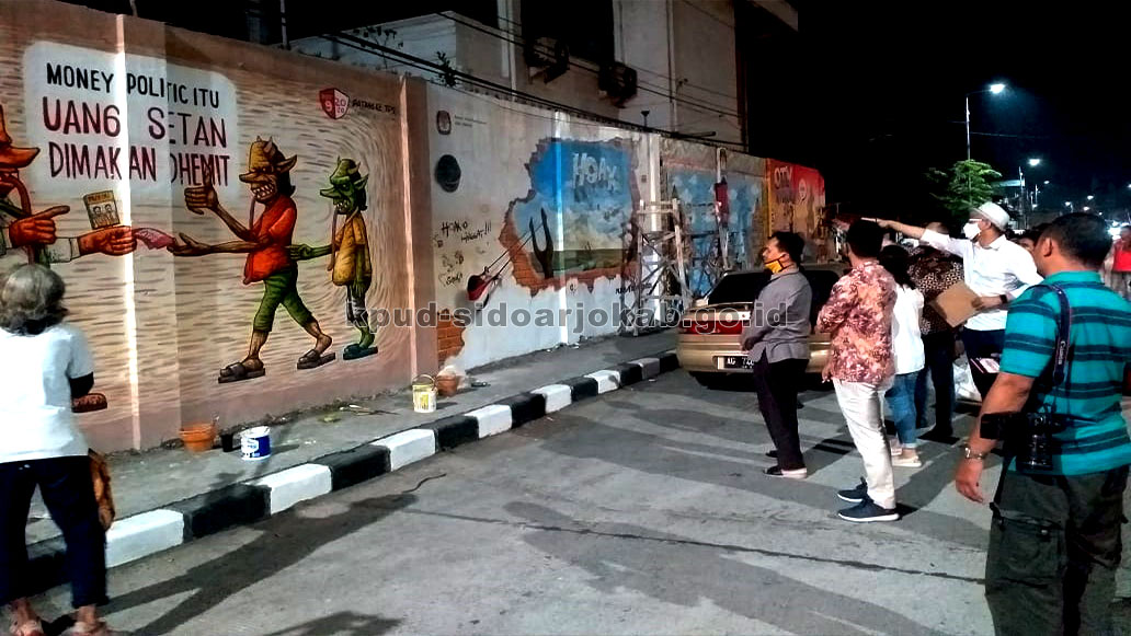 kpud-sidoarjokab.go.id-Lomba mural Pemilihan Bupati dan Wakil Bupati Kabupaten Sidoarjo Tahun 2020, yang diselenggarakan KPU Sidoarjo sejak Senin (17/08/2020) akhirnya berakhir pada Rabu (19/08/2020). Rabu malam itu juga, tim juri, EO, dan panitia yang terdiri dari komisioner dan sekretariat KPU Sidoarjo meninjau langsung ke lokasi lomba untuk melakukan penilaian. Diketahui, lokasi yang digunakan untuk lomba tersebar di beberapa titik strategis di wilayah kabupaten Sidoarjo.Tomas Hanandry dan Riko, ilustrator asal Surabaya sebagai juri lomba mural ini, mengatakan pada lomba mural kali ini banyak seniman yang membawa media-media, kesan-kesan dan teknik-teknik baru. Tomas juga menandaskan bahwa hal tersebut patut diapresiasi. Tapi baginya, penilaian bukan disitu saja, komposisinya juga harus dinilai. Unik dan kreatif untuk memvisualkan ide namun tetap harus sesuai dengan tema, estetis dan etikanya. Hal ini yang akan menentukan juaranya. "Paduan warna, gambar dan tulisan harus diperhatikan, apakah bisa terbaca dan sesuai. Mural ini kan berada di tempat umum, supaya dapat memberikan pesan dan mudah dibaca oleh masyarakat, yang melihatnya langsung mengerti pesan apa yang disampaikan karena muralnya berada di pingir jalan dan masyarakat tidak bisa melihat terlalu lama, hanya bisa sekilas. Oleh karena itu, harus enak dimata, pesannya juga nyampai. Itu yang menjadi fokus penilaian," jelasnya.Seniman asal Cepu, Jawa Tengah, Arisetiyo, yang datang jauh - jauh untuk mewakili dirinya sendiri sebagai pelaku seni dan para seniman lainnya mengatakan bahwa kegiatan ini sangat bermanfaat. Menurutnya, seniman sendiri memiliki aspirasi yang mewakili masyarakat, sebagai suatu kebutuhan untuk merespon kondisi sosial. "Seniman itu cenderung lebih jujur, nah disitulah letak peran dari seniman sebagai penyeimbang dalam masyarakat," papar Arisetiyo.Komisioner KPU Sidoarjo, Fauzan Adim mengungkapkan pihaknya merasa senang dan bangga lomba mural kali ini berjalan lancar dan diikuti peserta dari berbagai daerah, bahkan banyak yang dari luar Jatim. "Kami bangga kepada para peserta yang telah berhasil menyelesaikan mural pada lomba kali ini. Semalam, panitia, juri, dan EO sudah melihat langsung karya-karya luar biasa yang telah diselesaikan para seniman mural. Kami dari KPU Sidoarjo sangat mengapresiasi hal itu," ungkap Fauzan.Tak hanya itu saja, lomba mural yang bertujuan untuk mensosialisasikan Pilbup Sidoarjo pada 9 Desember 2020 ini rupanya sudah menarik perhatian masyarakat. Salah satu pengunjung yang membawa anaknya, melakukan hunting foto di lokasi mural. Ia mengatakan dirinya tertarik dengan karya-karya mural dari para peserta. Untuk itu, ia bahkan tak segan meminta ijin untuk berswafoto di depan lukisan mural yang tengah dirampungkan peserta. "Kegiatan ini sangat bagus dan menarik karena kegiatan seperti ini baru pertama kali dilaksanakan di Sidoarjo. Saya pun sebagai warga Sidoarjo sangat mendukung kegiatan KPU. Semoga pemilihan Bupati dan Wakil Bupati Sidoarjo berjalan sukses," tandasnya ketika ditanyai salah satu panitia. (syamsudin)