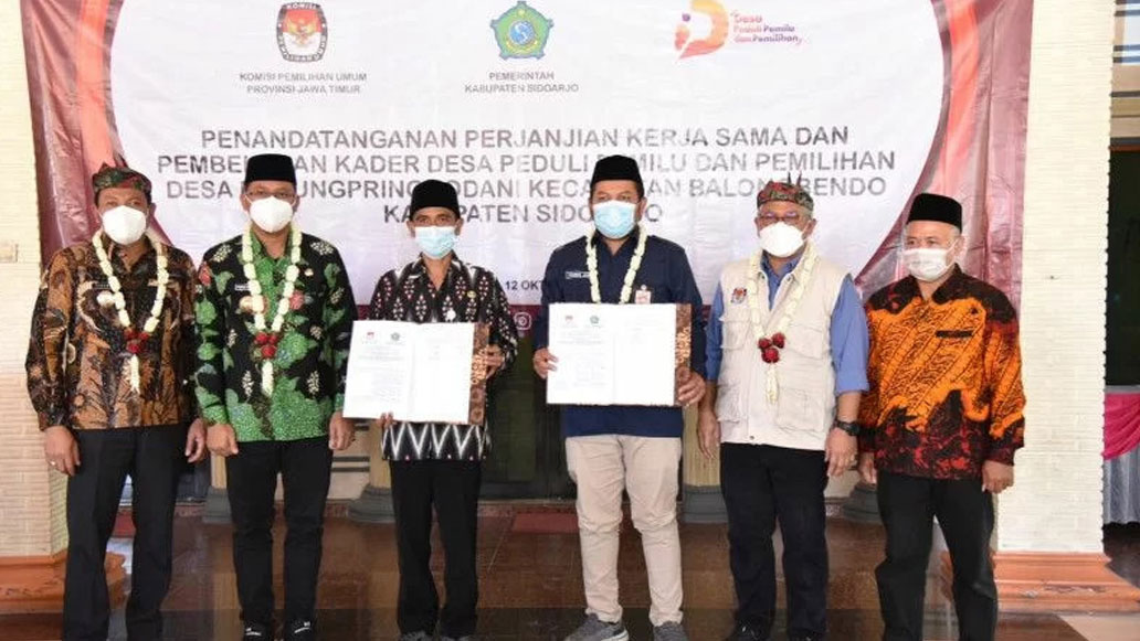 Sidoarjo,kpud-sidoarjokab.go.id- Selasa (12/10), KPU Provinsi Jawa Timur melaksanakan kegiatan Penandatanganan Perjanjian Kerja Sama dan Pembekalan Kader DP3 di desa Bakungpringgodani, Kecamatan Balongbendo, Kabupaten Sidoarjo. Hadir dalam kegiatannya ini diantaranya Komisioner KPU RI, Arief Budiman, Bupati Sidoarjo, Ahmad Muhdlor dan Wakil Bupati Sidoarjo,Subandi, seluruh Komisioner KPU Provinsi Jawa Timur dan seluruh Komisioner KPU Kabuten Sidoarjo, jajaran forkopimka, Camat Balongbendo, Kepala Desa Bakungpringgodani serta perangkatnya.Dalam sambutannya, Bupati Sidoarjo, Ahmad Muhdlor Ali menyatakan sangat mendukung program Desa Peduli Pemilu dan Pemilihan (DP3) yang dilaksanakan di wilayahnya. “Karena peningkatan kapasitas terkait penyelenggaraan pemilu dan pemilihan ini, apapun itu bentuknya dalam rangka meningkatkan kualitas pemilu dan pemilihan itu sendiri. Semakin berkualitas pemilu dan pemilihannya, maka akan semakin berkualitas produk yang dihasilkannya. Produknya berupa DPR, Gubernur, Bupati, Presiden dan sebagainya,” tandas Bupati Sidoarjo ini.Selain mendukung, Bupati Sidoarjo ini juga mengapresiasi pelaksanaan program DP3. “Kami mengapresiasi cara peningkatan kapasitas seperti ini, karena memberikan pemahaman masyarakat sedari awal sehingga masyarakat bisa tahu pentingnya untuk edukasi politik. Masyarakat pun akhirnya paham, bahwa 5 menit yang ada di bilik itu berefek 5 tahun kemudian, bukan hanya sekedar 1 atau 2 hari. Dengan demikian, kedepan masyarakat akan lebih cermat lagi dalam menentukan pilihannya,” jelas pria dengan sapaan akrab Gus Muhdlor ini.Menutup sambutannya, Gus Muhdlor kembali menegaskan kegiatan peningkatan kualitas kader DP3 ini bukan hanya tanggung jawab KPU, tapi juga tugas pemerintah daerah dan seluruh masyarakat. “Jadi mari Kita dorong bersama program DP3 ini,” tegasnya.Selanjutnya Komisioner KPU RI, Arief Budiman menyampaikan bahwa di tahun 2021 sebenarya target program DP3 di seluruh provinsi dan di seluruh kabupaten/ kota, tapi karena situasi pandemi jadi diatur bertahap. “Sehingga untuk tahun 2021 ada di 34 provinsi, tapi tiap provinsi hanya Kita beri kesempatan 2 daerah. Nah, Kami serahkan KPU Provinsi untuk memilih, menunjuk daerah mana yang siap bekerja sama dengan Kita. Nah, daerah di Jawa Timur yang dinilai siap yakni Kabupaten Sidoarjo dan Kota Surabaya,” ungkap Arief (12/10/2021).Lebih lanjut, Arief berterima kasih pada Bupati Sidoarjo karena berkenan memfasilitasi program DP3 kemudian menjadikan salah satu desanya menjadi target pelatihan KPU. “Tanpa dukungan dan kerja sama dari pemerintah daerah tentu kegiatan ini tidak bisa berlangsung dengan baik, karena kalau tidak kerja sama Kita agak kerepotan. Karena ini bukan pekerjaan yang mudah, bukan pekerjaan yang murah, memang membutuhkan dukungan dari pemerintah daerah,” tutur mantan Komisioner KPU Jatim ini.Arief pun berharap ke 25 kader DP3 yang telah dilatih akan dapat meneruskan informasi yang KPU sampaikan kepada masyarakat yang lebih luas.“Mudah-mudahan 25 orang yang Kita latih ini, mereka nanti bisa meneruskan informasi kepada masyarakat. Saya tentu berharap, kalau informasi ini sudah sampai ke masyarakat akan terus menyebar, sehingga makin banyak orang mau terlibat dalam proses penyelenggaraan pemilu Kita. Makin banyak orang peduli akan pemilu Kita,” terangnya.Kegiatan berlangsung dari jam 9 pagi sampai 4 sore, diawali dengan penandatanganan kerja sama lalu dilanjutkan dengan pembekalan para kader. Pembekalan pun dikemas dengan sangat menarik sehingga peserta sangat antusias mengikuti sampai akhir acara.(HUPMAS)
