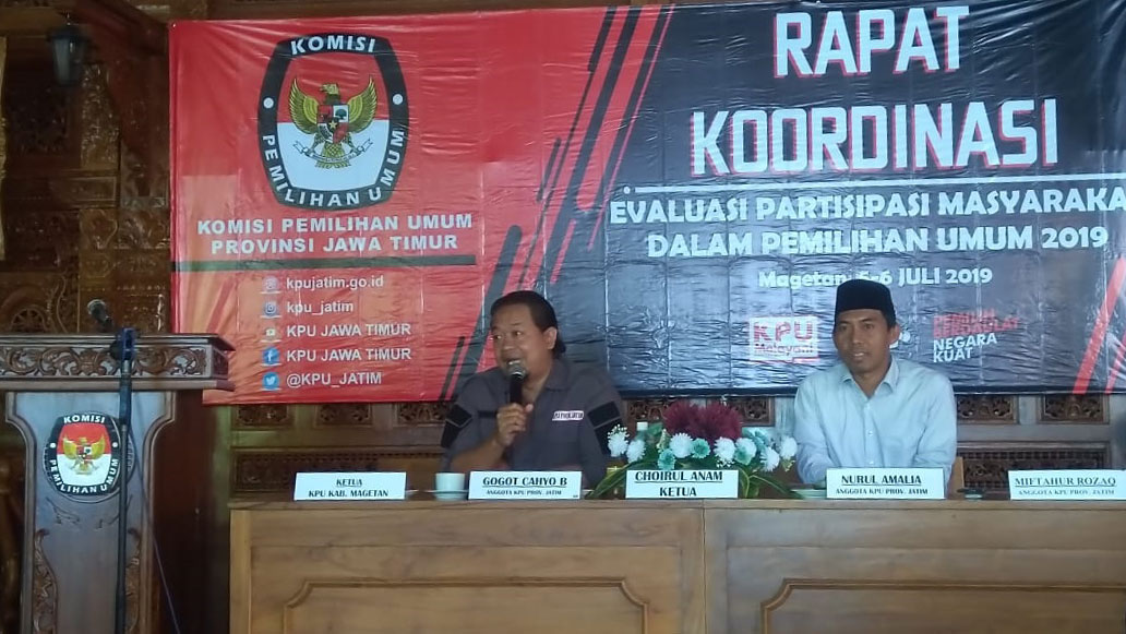 kpud-sidoarjokab.go.id – Usai resmi dilantik pada 13 Juni lalu, Anggota KPU Kabupaten Sidoarjo telah menduduki Divisinya masing-masing.Rabu (3/7) KPU Kabupaten Sidoarjo di pimpin langsung Ketua KPU Mukhammad Iskak lakukan evaluasi Pemilu 2019 di Kabupaten Sidoarjo.Diawali dengan perkenalan Anggota baru KPU, Iskak mengenalkan satu-persatu Anggota baru dengan masing-masing Divisinya.Berlangsung di Fave Hotel, evaluasi dimulai pukul 13.00 WIB dan di ikuti PPK Pemilu 2019. “Alhamdulillah pada Pemilu 2019 ini, Kabupaten Sidoarjo sangatlah kondusif. Selain itu partisipasi Masyarakat sangatlah tinggi dan berada di angka 85 %.” Terang Iskak dalam sambutannya.Sementara, Sekretaris KPU Sulaiman memberikan sedikit materi terkait evaluasi akhir anggaran Pemilu 2019.Pada kesempatan yang sama, Ketua KPU periode 2014 – 2019 M. Zainal Abidin, Komisioner Divisi Perencanaan & Data Abdillah Adhi, dan Komisioner Divisi Hukum Nanang Haromin turut hadir dalam kegiatan evaluasi dan pisah kenal tersebut.Dihadapan PPK se-Kabupaten Sidoarjo, Zainal mengucapkan terimakasih telah menyelesaikan Pemilu yang sungguh luar biasa. “Semuanya telah menjadi guruku, menjadi sahabatku, dan menjadi teman mulyaku. Saling mendoakan semoga semakin hari semakin ada nilai dalam hidup.” Jelas Zainal.Kegiatan yang berlangsung selama dua jam tersebut diakhiri dengan pemberian tali asih kepada Ketua dan Anggota KPU periode 2014 – 2019 dan penghargaan kepada PPK terbaik antara lain PPK Balongbendo dengan kategori pengelolaan data pemilih terbaik, PPK Krembung terbaik dalam teknis penyelenggaraan, PPK Tarik terbaik dalam tingkat partisipasi Masyarakat, dan PPK Gedangan terbaik dalam kepatuhan penyampaian LPJ.(ryan)