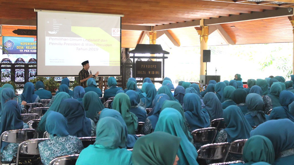 kpud-sidoarjokab go.id – Selain dapat meningkatkan partisipasi pemilih, sosialisasi juga dipastikan dapat mengurangi potensi surat suara yang tidak sah dalam pemungutan suara mendatang.Beragam sasaran sosialisasi mulai dari pemilih pemula, pemilih disabilitas hingga pemilih perempuan.Kamis (7/2), Ketua KPU Kabupaten Sidoarjo M. Zainal Abidin bersama Relawan Demokrasi Basis Perempuan Nilam Cahyandari sosialisasikan Pemilu 2019 di kegiatan TP-PKK Kabupaten Sidoarjo yang berlangsung di Pendopo Delta.Sementara itu Zainal selaku Narasumber utama memaparkan beberapa materi antara lain peserta pemilu hingga jumlah kursi pada DPRD Kabupaten Sidoarjo.Selain itu, bersama Nilam, dihadapan Istri Bupati Sidoarjo Hj. Anik Saiful Ilah dan Ibu-ibu PKK lainnya, Zainal menunjukkan lima specimen surat suara yang berbeda mulai dari DPR RI, DPD, DPRD Provinsi, DPRD Kabupaten, dan surat suara Presiden dengan warna yang berbeda-beda.Di akhir sosialisasi Zainal mengajak Ibu-Ibu PKK agar tidak golput pada Pemilu mendatang. “Golput bukanlah solusi dan tidak dapat mengubah apapun, sebagai contoh biaya hidup semua tergantung pada keputusan politik.” Jelas Zainal.(ryan)