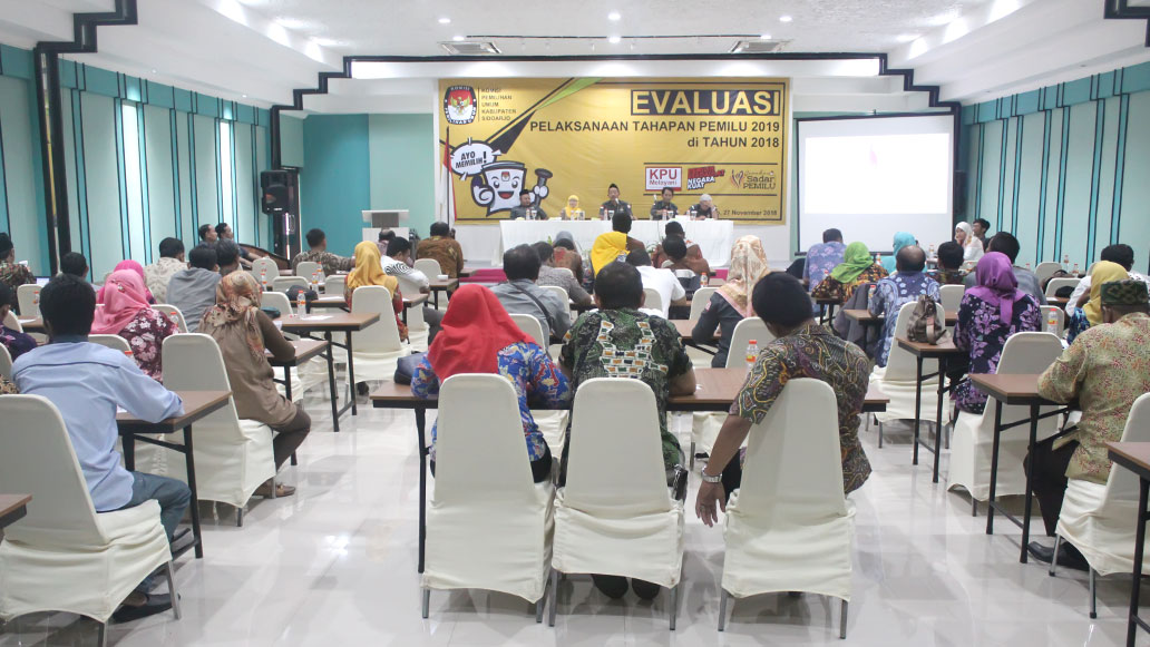 kpud-sidoarjokab.go.id – Berbagai kegiatan tahapan pemilu 2019 telah dilaksanakan KPU Kabupaten Sidoarjo, mulai dari tahapan pencalonan hingga tahapan kampanye Pemilu 2019.Selasa (27/11) KPU Kabupaten Sidoarjo lakukan evaluasi pelaksanaan tahapan Pemilu 2019 di tahun 2018. Evaluasi yang berlangsung di Hotel Shofia Juanda, di ikuti PPK serta Sekretaris PPK se-Kabupaten Sidoarjo.Ketua KPU Kabupaten Sidoarjo M. Zainal Abidin mengungkapkan bahwa Prinsip Pemilu saat ini adalah keterbukaan yang dibangun oleh KPU RI yang menginginkan keterbukaan itu mudah dikawal oleh semua pihak.“Kebijakan baik dalam pengelolaan keuangan maupun kebijakan yang lain prinsipnya kami KPU Kabupaten sebagai pihak yang meneruskan kebijakan-kebijakan yang diambil KPU RI.” Jelas Zainal dalam sambutannya.Pada evaluasi pelaksanaan tahapan Pemilu 2019, masing-masing Divisi memberikan paparan dihadapan peserta evaluasi. Materi yang disampaikan antara lain terkait logistik, tahapan kampanye, pencalonan, data pemilih, hingga sosialisasi terkait pengawasan Pemilu 2019.Selain itu, Sekretaris KPU Kabupaten Sidoarjo Sulaiman memaparkan materi tentang penyaluran anggara Badan Ad-hoc.(ryan)
