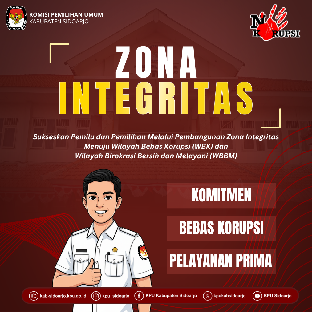 Komisi Pemilihan Umum (KPU) Kabupaten Sidoarjo berkomitmen penuh dalam mewujudkan tata kelola pemerintahan yang bersih, transparan, dan akuntabel melalui penerapan Zona Integritas (ZI) menuju Wilayah Bebas dari Korupsi (WBK) dan Wilayah Birokrasi Bersih dan Melayani (WBBM). Penerapan Zona Integritas merupakan bagian penting dari upaya reformasi birokrasi di lingkungan KPU, sejalan dengan misi menciptakan lembaga penyelenggara pemilu yang profesional, berintegritas, dan dipercaya oleh masyarakat.